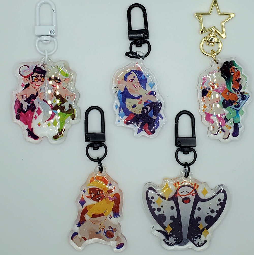 2'' glitter epoxy charms with the Splatoon 1 & 2 charms being double sided! Every order comes with a freebie sticker and a doodle. If you have a specific request in mind feel free to leave one in the note section of your order.